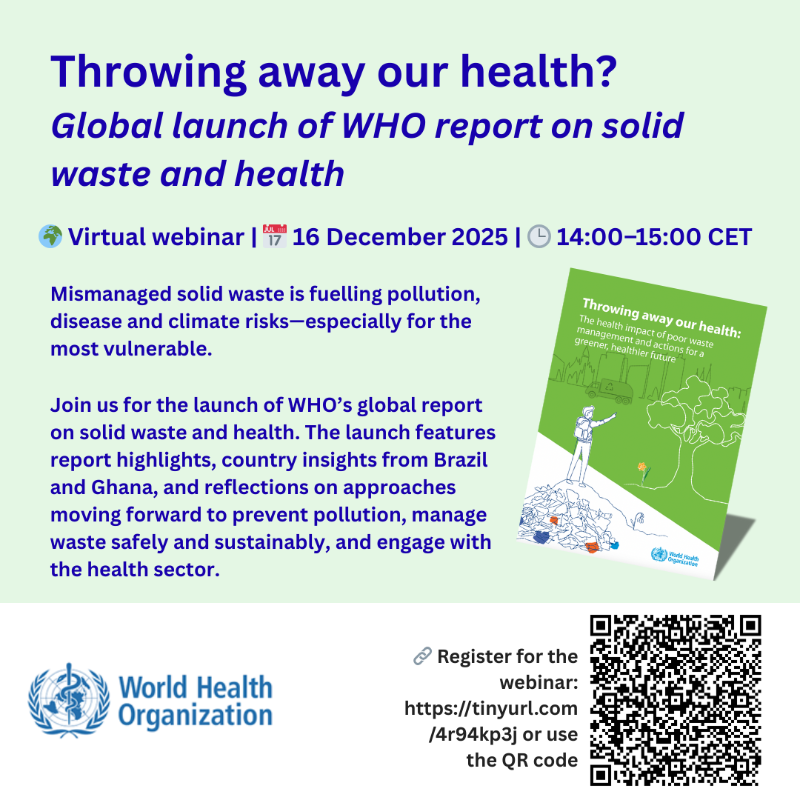 Mismanaged solid waste fuels pollution, disease and climate risks – and undermines safe WASH. WHO’s forthcoming report “Throwing away our health?” shows how waste & WASH systems can better protect health. Join the launch webinar 16 Dec, 14:00–15:00 CET: tinyurl.com/4r94kp3j